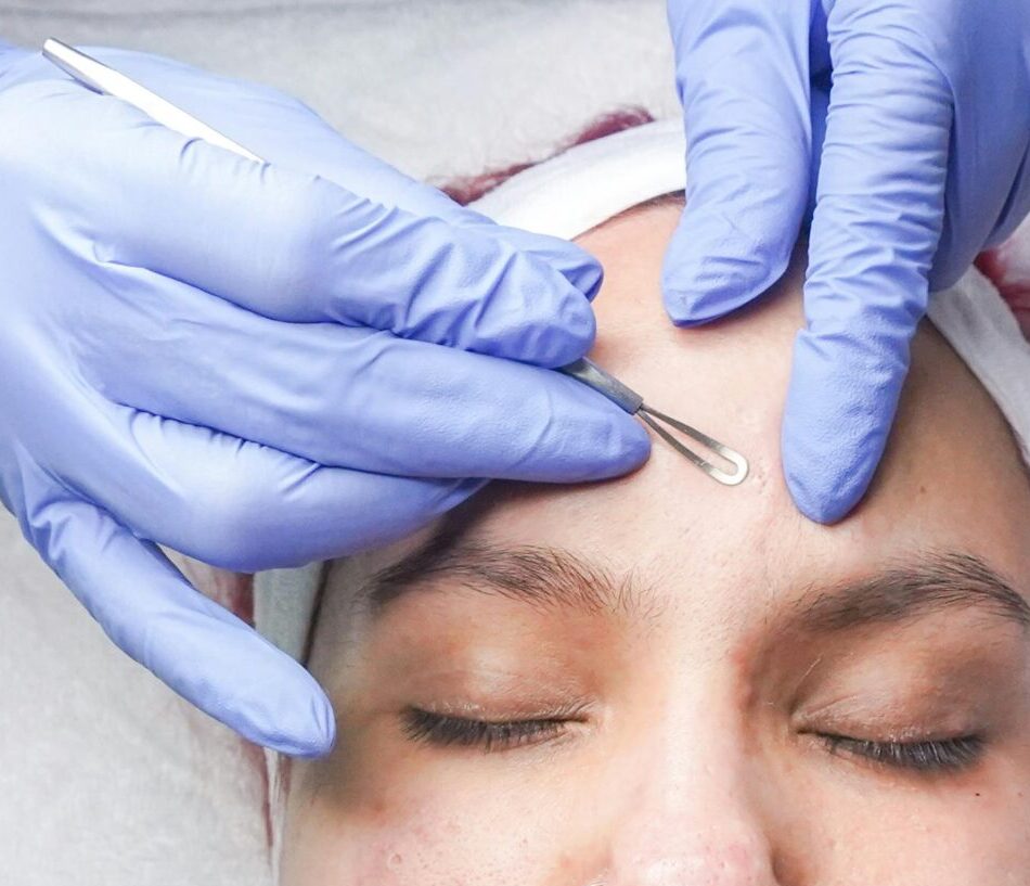Step 3) You want to make sure to have the proper protective gloves or finger cots on. I personally prefer to use either a tissue or 4×4 to perform extractions. I wrap the tissue around my extracting fingers and it helps to keep the gloves from sliding and as you are doing the extraction it cleans up what ever is coming out of the pores. You can also use a comedone extractor tool. I have used these on occasion but because they are metal they can hurt and also leave the skin more red. The best one I have found that can work is a thin wire one. The less metal the better. Also as far as lancets go you want to make sure that legally your state allows you to use lancets. If someone has a large pustule on the face and you cannot use a lancet I usually leave it alone. You don’t want it to turn the skin super red and have the pus release under the skin. If you feel that you can get it by popping off the pus top then go for it but just take into consideration that the skin can be more red.